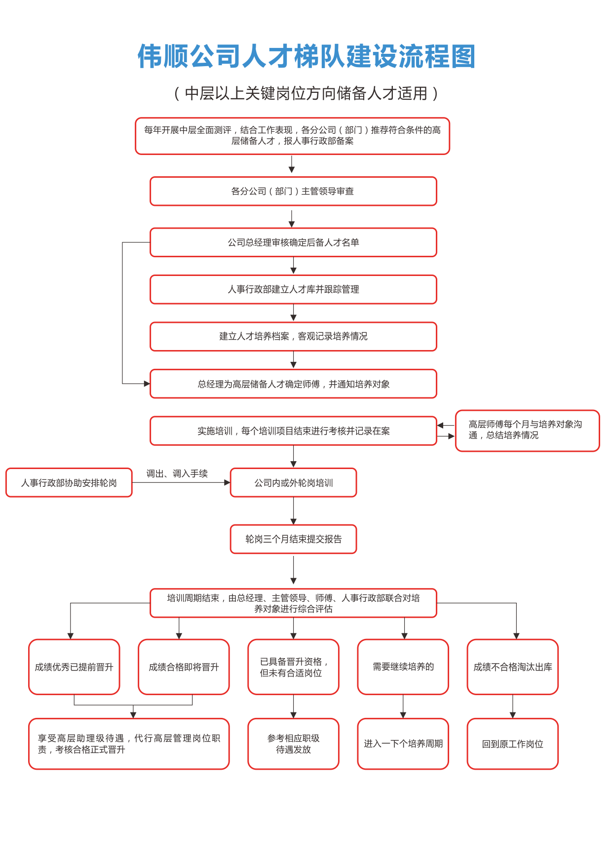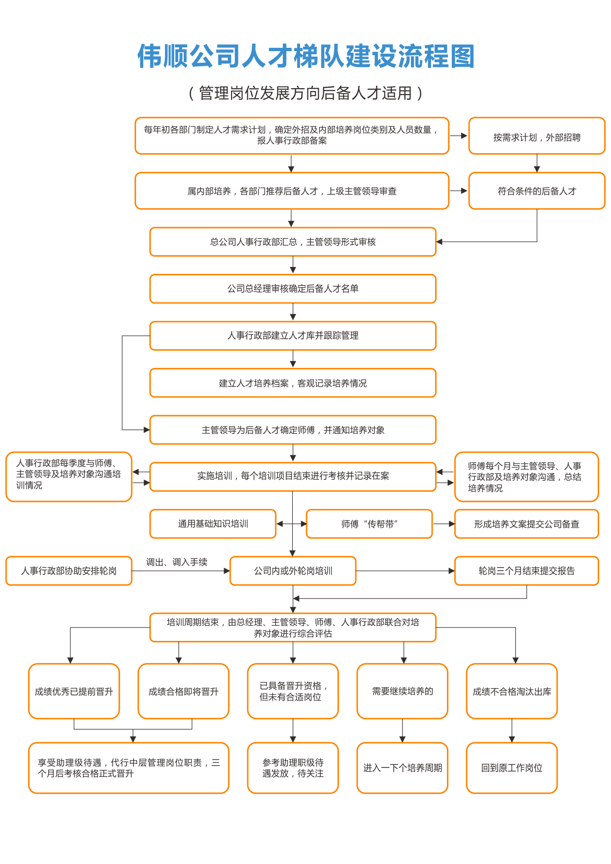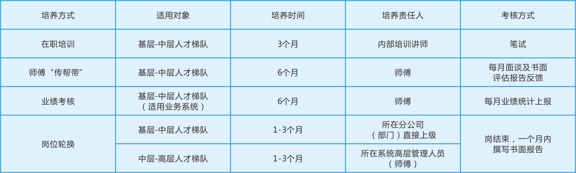 1、将一批有发展潜质的人才纳入公司实施的人才培养计划,发挥梯队人才中坚力量的作用。 2、指导与规范后备人才梯队的培养工作,建立后备人才的培养机制。3、与企业发展战略同步,使企业在需要时有人可用。